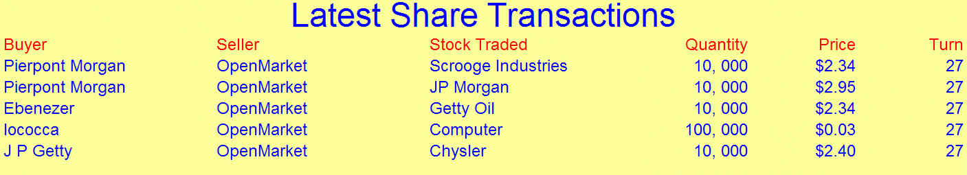 Here you can see who was successful in buying shares during the last 60 seconds. (60 seconds in this game represents 1 month of business activity) |