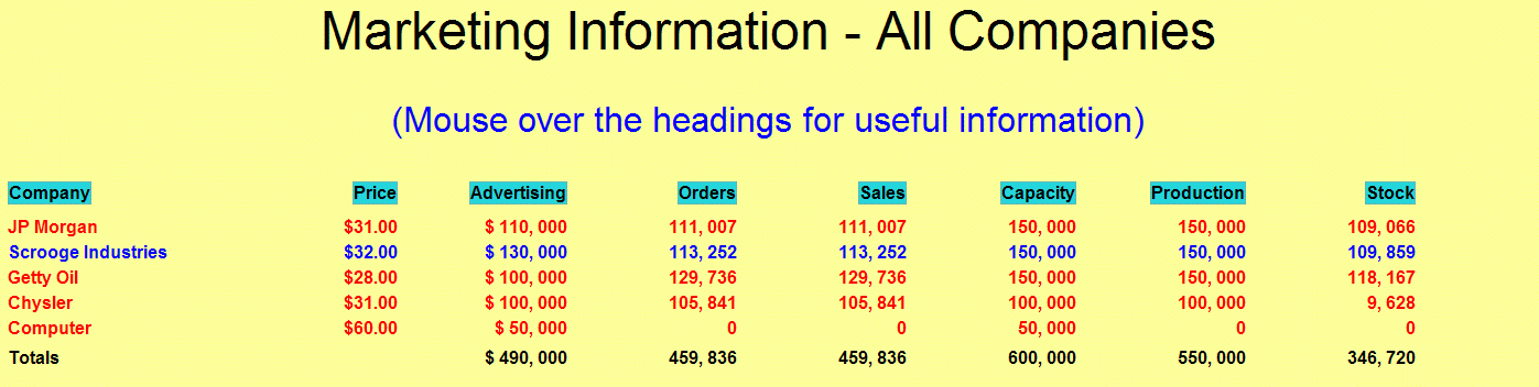 market with their classmates. 2/ The effect of price and advertising on market share and sales. 3/ Which mix of price and advertising may be best for the current market conditions. 4/ Which companies are being managed well, and may be targets for investment. |